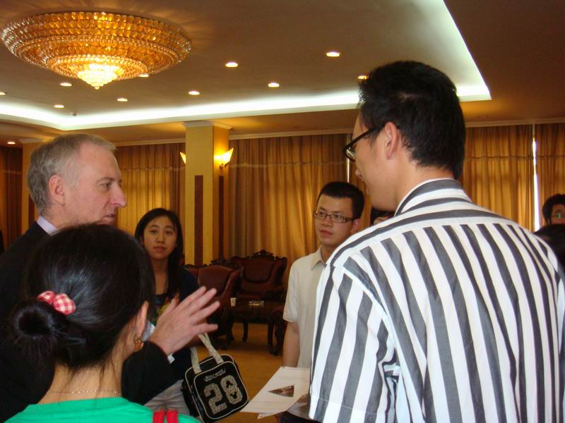 院长汪祖杰教授向Mr. Stewart Falconer颁发金融学客座教授聘书。 晚上, Mr. Stewart Falconer、高善生教授作了题为“金融危机下金融教育的功能”讲座。Mr Stewart Falconer教授首先以一段精彩诙谐的开场白引出了全场讲座的主题,他阐述了金融服务业的现状,分析了信用的功能和金融服务业的积极作用。同学们也十分踊跃地与教授进行互动,用流利的英文向他提出自己的疑问,Mr. Stewart Falconer教授一一作了解答。 6月5日上午,在莫愁行政楼会议室,Mr. Stewart Falconer一行与怡红院