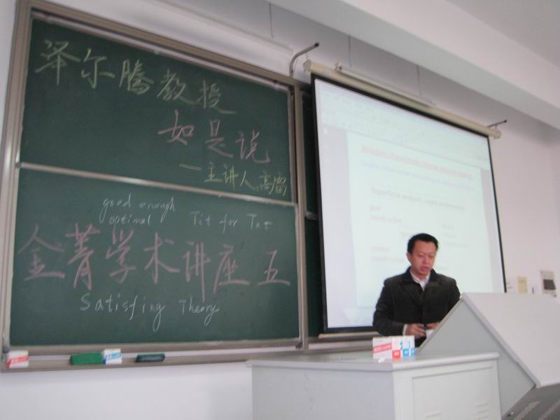 2010年11月12日,由怡红院 科协和科研处共同主办的金菁学术讲座之五――“泽尔腾教授如是说”在敏达207如期举办。此次讲座由怡红院 常务副院长、李嘉诚基金会特聘教授、德国汉诺威大学金融学博士、德国图灵根大学博士后、德国波恩大学泽尔腾实验室博士后高雷教授主讲。