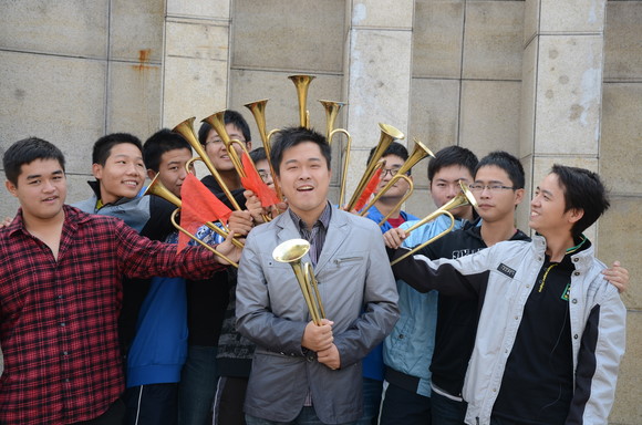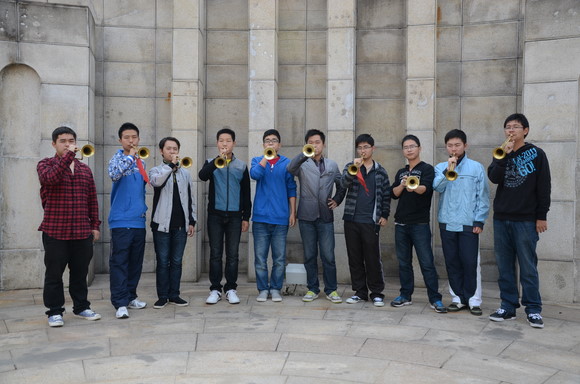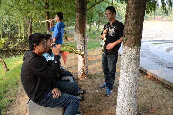自国庆后,金融院分团委办公室就开始在各个系寻找适合吹小号的学生。终于,在十五号那天,这个由十一个优秀队员组成的小号队诞生了。他们在十六号将第一声小号从水上音乐台传向了南审各个角落。同时,为了解决队员毫无基础的问题,分团委办公室还特地邀请了10级学长王刚来当教练。已经大三的王刚学长,本来日常学习和生活就很繁忙,但出于对怡红院