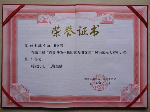 5月4日下午,南京审计学院第二届五四表彰大会暨“我的魅力团支部”风采大赛在金审体育馆隆重拉开大幕,2010级金融4班作为唯一一个进入决赛的2010级和唯一一个怡红院 参赛队伍,以总分第四的优异成绩,勇夺本次比赛的二等奖。
