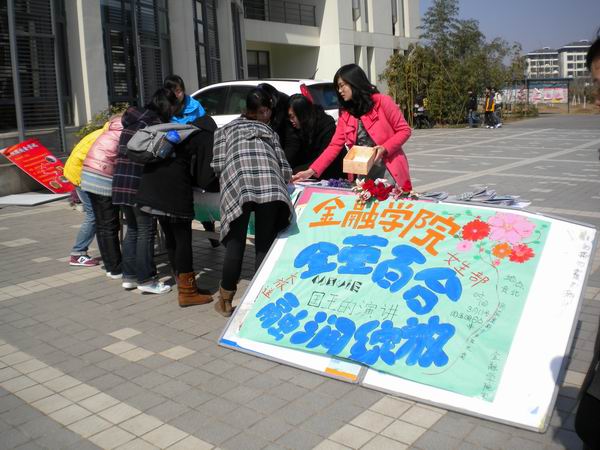 2011年3月7日中午,怡红院 女生部在泽园食堂门口举行了“金莹百合,融润绽放”的大型签名送祝福赠鲜花的活动,欢庆女生节,本次活动分为两个部分,第一部分,签名送祝福;第二部分,抽签赢花束。