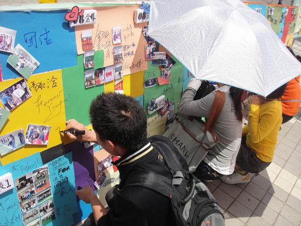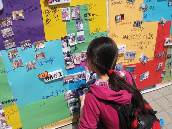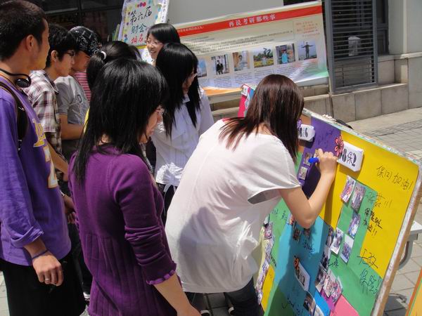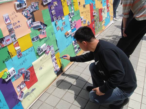 活动现场气氛极为热闹,许多院内院外的同学都纷纷积极参与,在照片展板上为自己喜爱的班级留言。院党总支副书记张成老师和老师也来到了活动现场给予支持,细心地听取宣传部有关人员的讲解后也在展板上写下了对同学们最真诚的祝福,并对本次活动给予了充分的肯定。