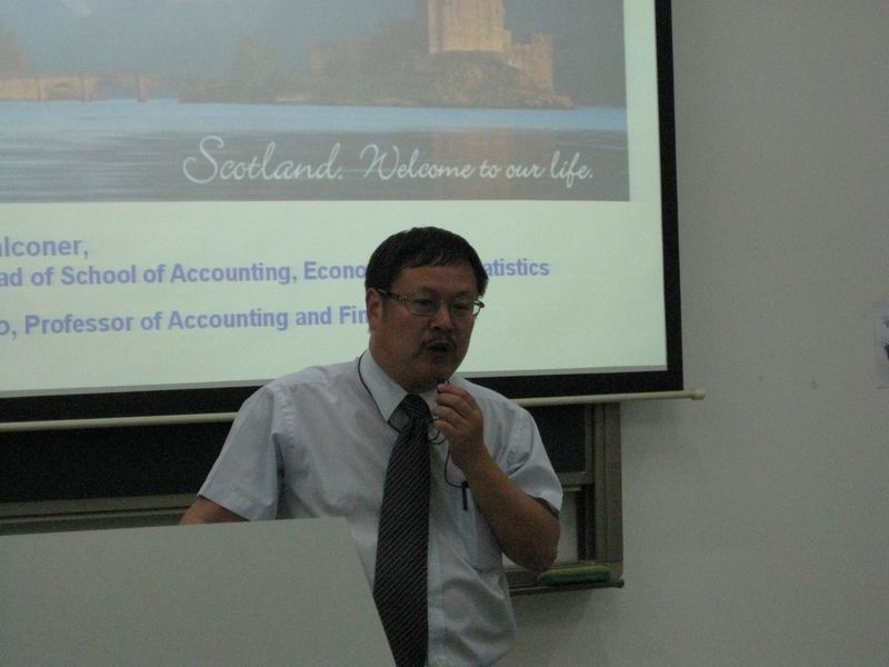 | Financial crisis ―The role of financial services education 6月4日晚上,英国爱丁堡龙比亚大学Stewart Falconer教授、高善生教授来到南审,在敏达楼301教室为怡红院 的同学们就金融危机下的金融服务业进行了一场气氛热烈的讲座与互动。 Stewart Falconer教授首先以一段精彩诙谐的开场白引出了全场讲座的主题,他从对金融服务业的介绍、现状、信用和专业化的重要性以及金融服务业的积极作用四方面系统地阐述分析了自己的观点与看法。同学们也十分踊跃地与教授进行互动,用流利的英文向他提出自己的疑问,Stewart Falconer教授一一做了解答。 最后,高善生教授向同学们介绍了爱丁堡龙比亚大学的相关情况并热情地邀请同学们赴爱丁堡留学。汪祖杰院长也做了简短的讲座总结。在同学们热烈的掌声中,这次讲座圆满结束。讲座结束后,Stewart Falconer教授又与一部分同学进行了面对面的交流,他的讲述让同学们印象深刻,受益匪浅。