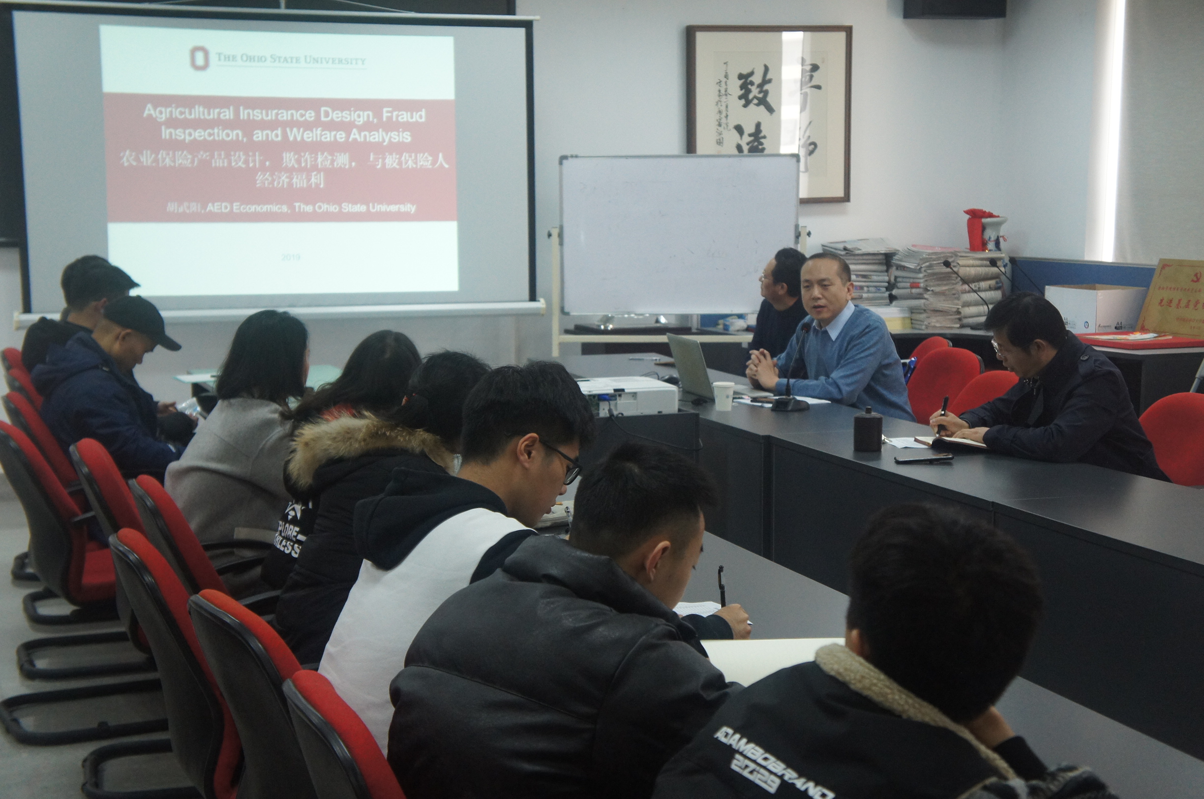 12月16日下午,美国俄亥俄州立大学AED经济系教授、博士生导师胡武阳应邀来访我校怡红院 ,在敏达楼516会议室开展了主题为“农业保险产品设计、欺诈检测与被保险人经济福利”的学术讲座。怡红院 副院长石岿然教授主持讲座,部分教师与全体19级金融学硕士研究生参加了本次活动。