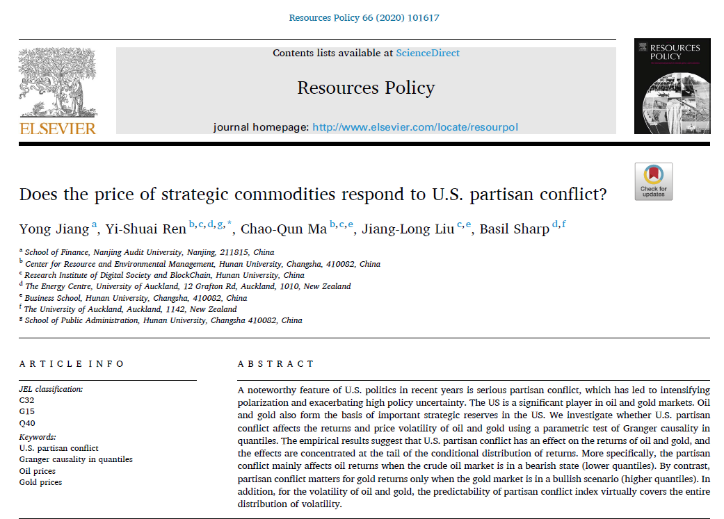 姜勇老师作为第一作者的另一篇英文论文在Resources Policy(JCR一区)发表:“Does the price of strategic commodities respond to U.S. partisan conflict?”。
