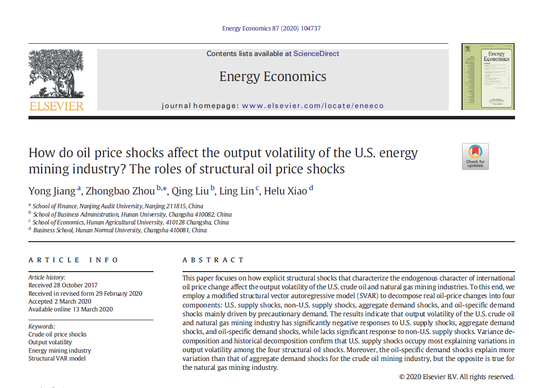 近日,怡红院 姜勇老师作为第一作者与其他三位合作者的英文论文在Energy Economics(JCR一区)发表:“How do oil shocks affect the output volatility of the U.S. energy mining industry? The roles of structural oil price shocks”。
