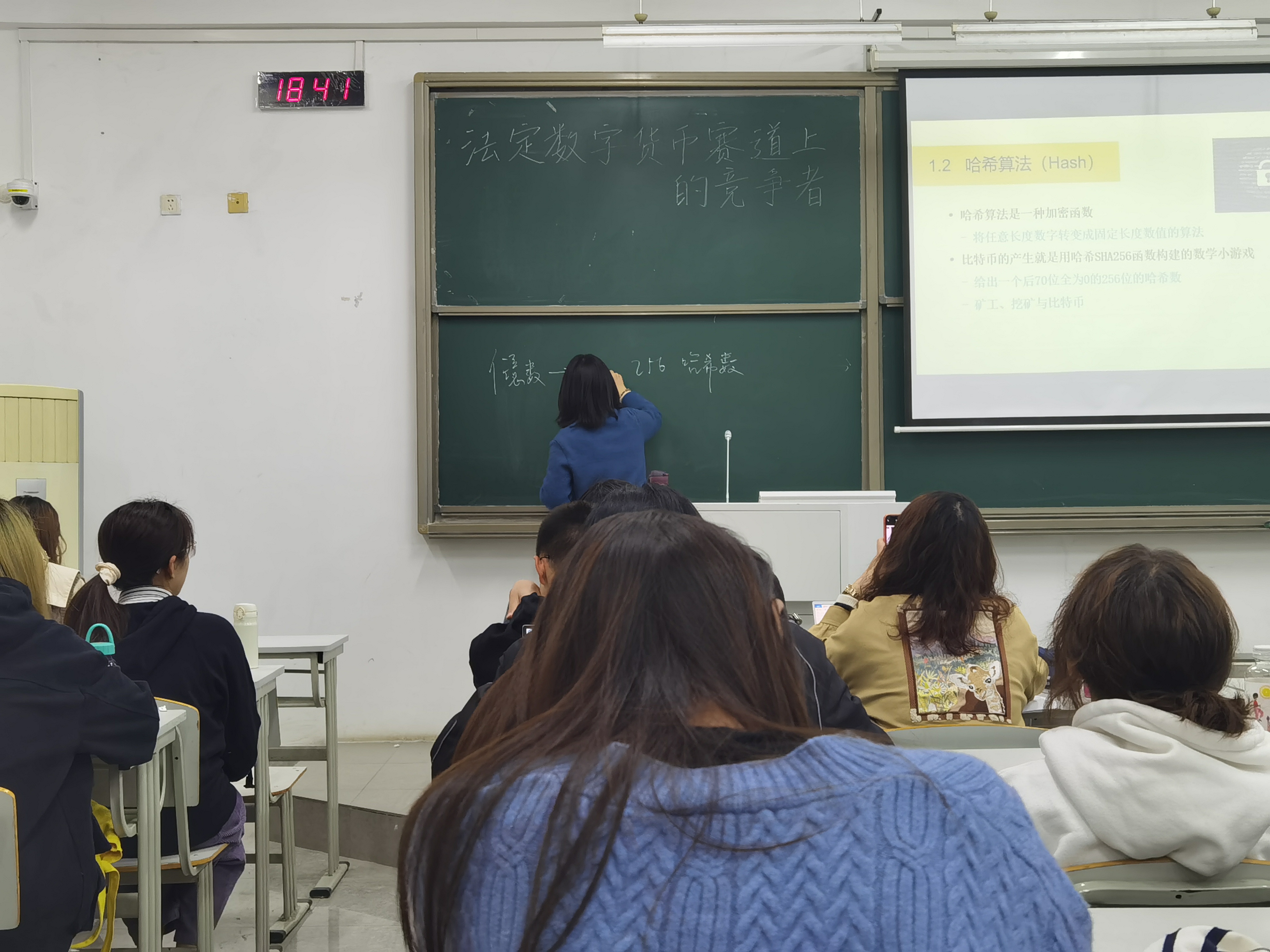 在对比特币初步介绍之后,杨芳老师以一种加密函数-哈希函数来解说比特币的产生。同时,就比特币和支付宝为例讲解了比特币与其他无形货的区别在于是否是基于区块链技术与密码学技术唯一性算法。并为同学们详细介绍了数字货币的分类。