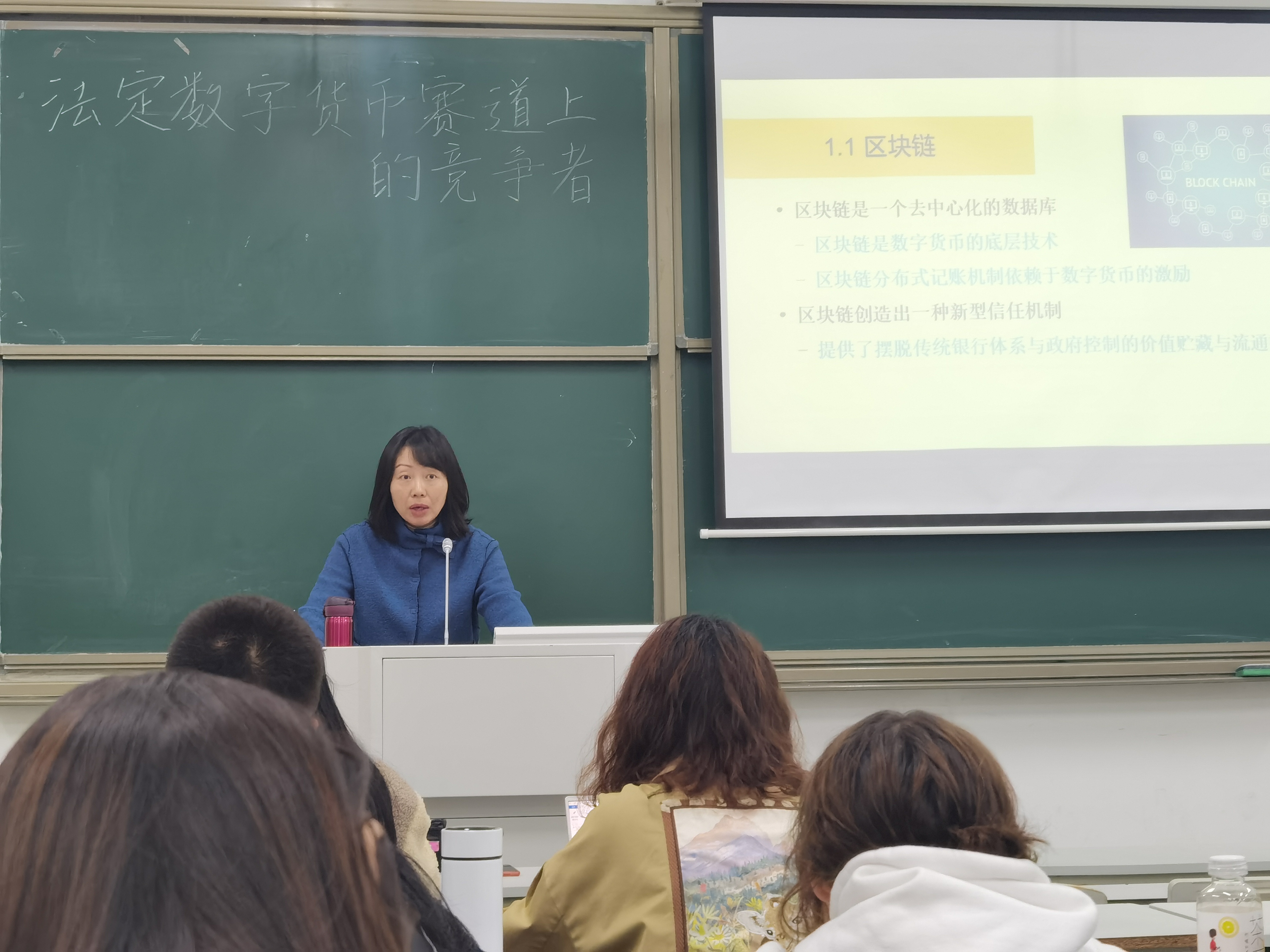 讲座开始,杨芳老师以比特币引入,讲述了比特币的本质是一个基于区块链技术的猜数小游戏。而区块链作为一个去中心化的数据库,它是数字货币的底层技术并且其分布式记账机制依赖于数字货币的激励,而且区块链创造出一种新型信任机制,为摆脱传统银行体系与政府控制的价值贮藏与流通提供了媒介。