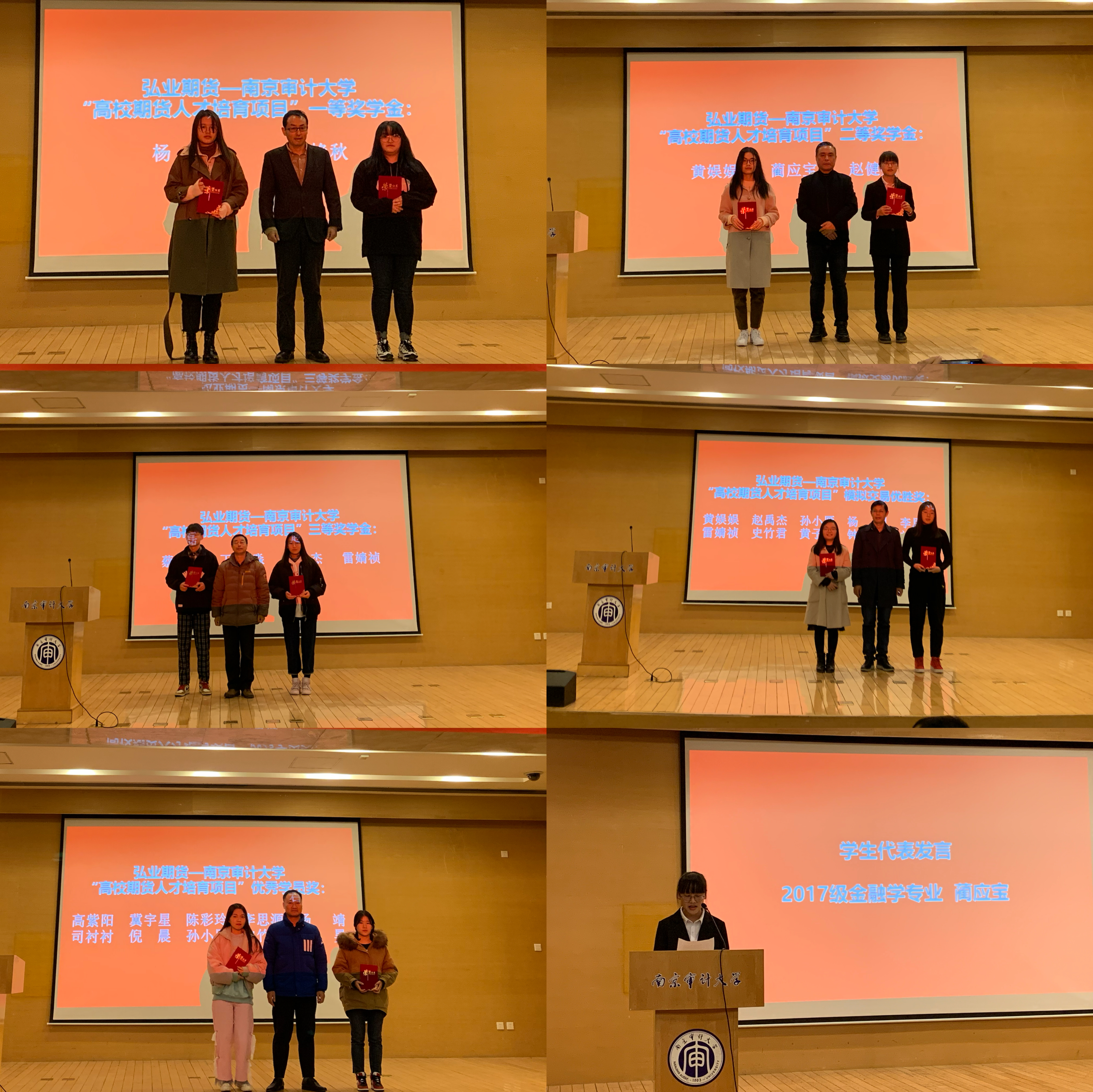 随后,到场的各位领导和嘉宾为获奖同学颁发证书,并与他们合影留念。来自2017级金融学专业的蔺应宝同学作为获奖代表上台发言,并代表全体同学向为培育项目辛勤付出的学校、公司和老师表示感谢。