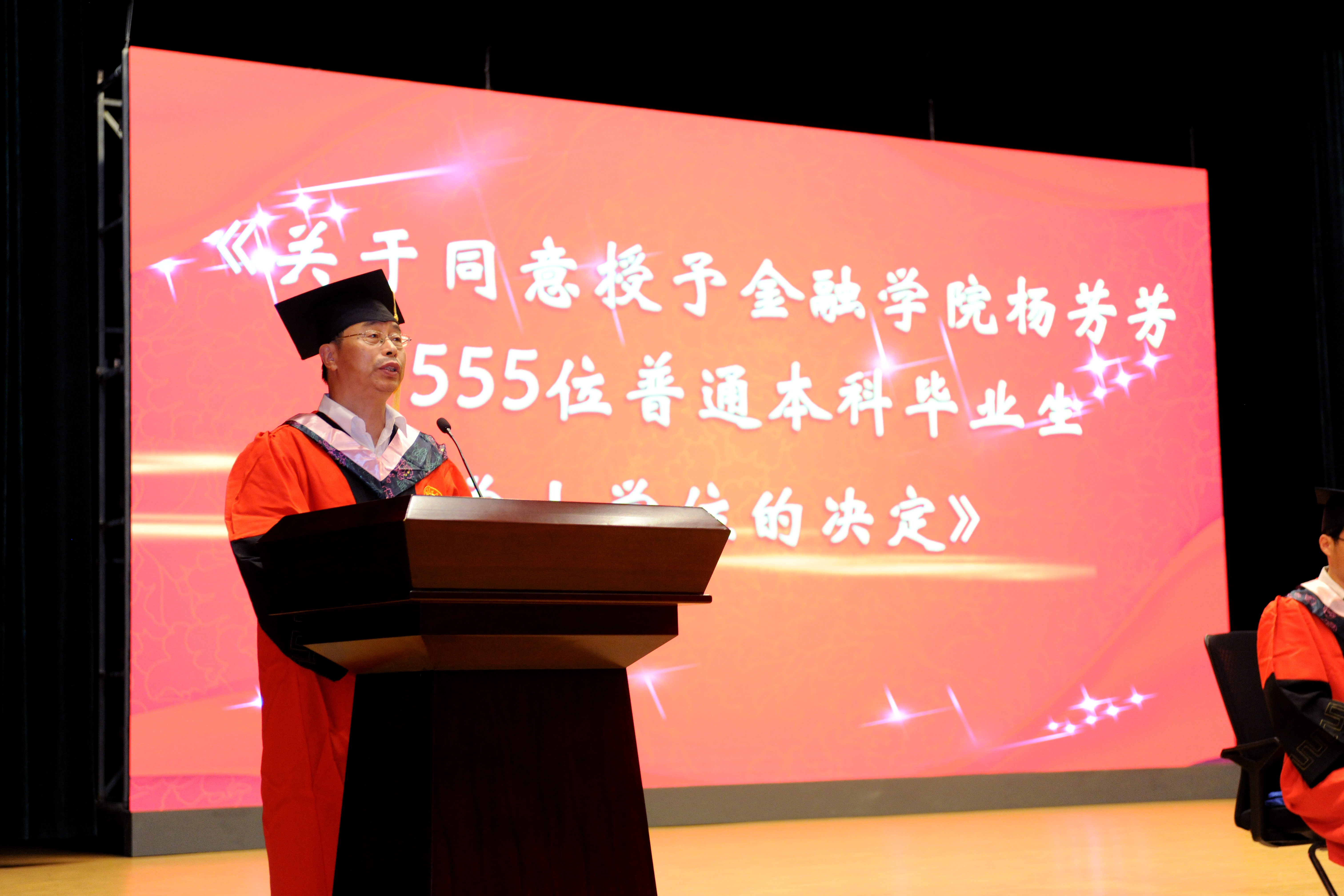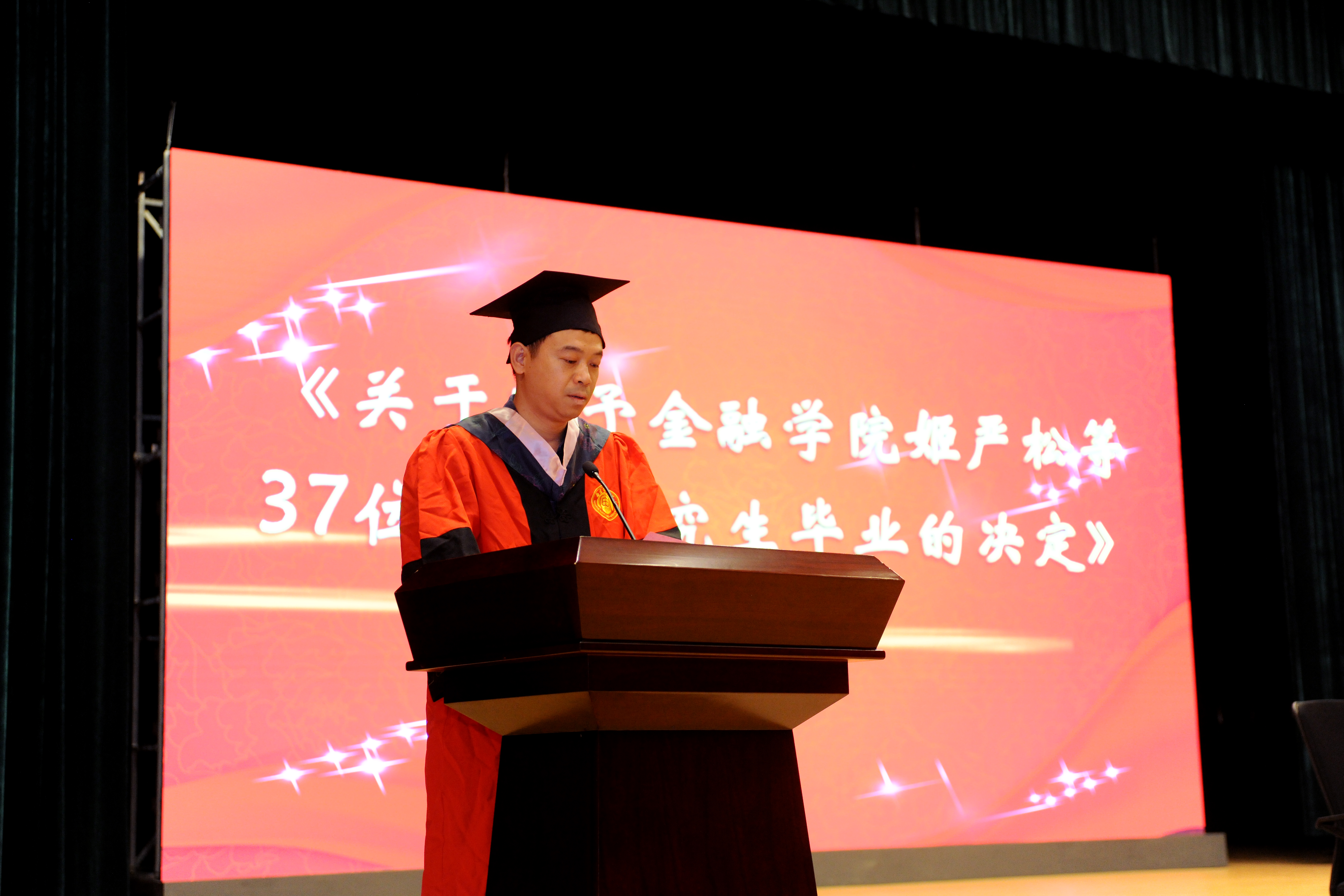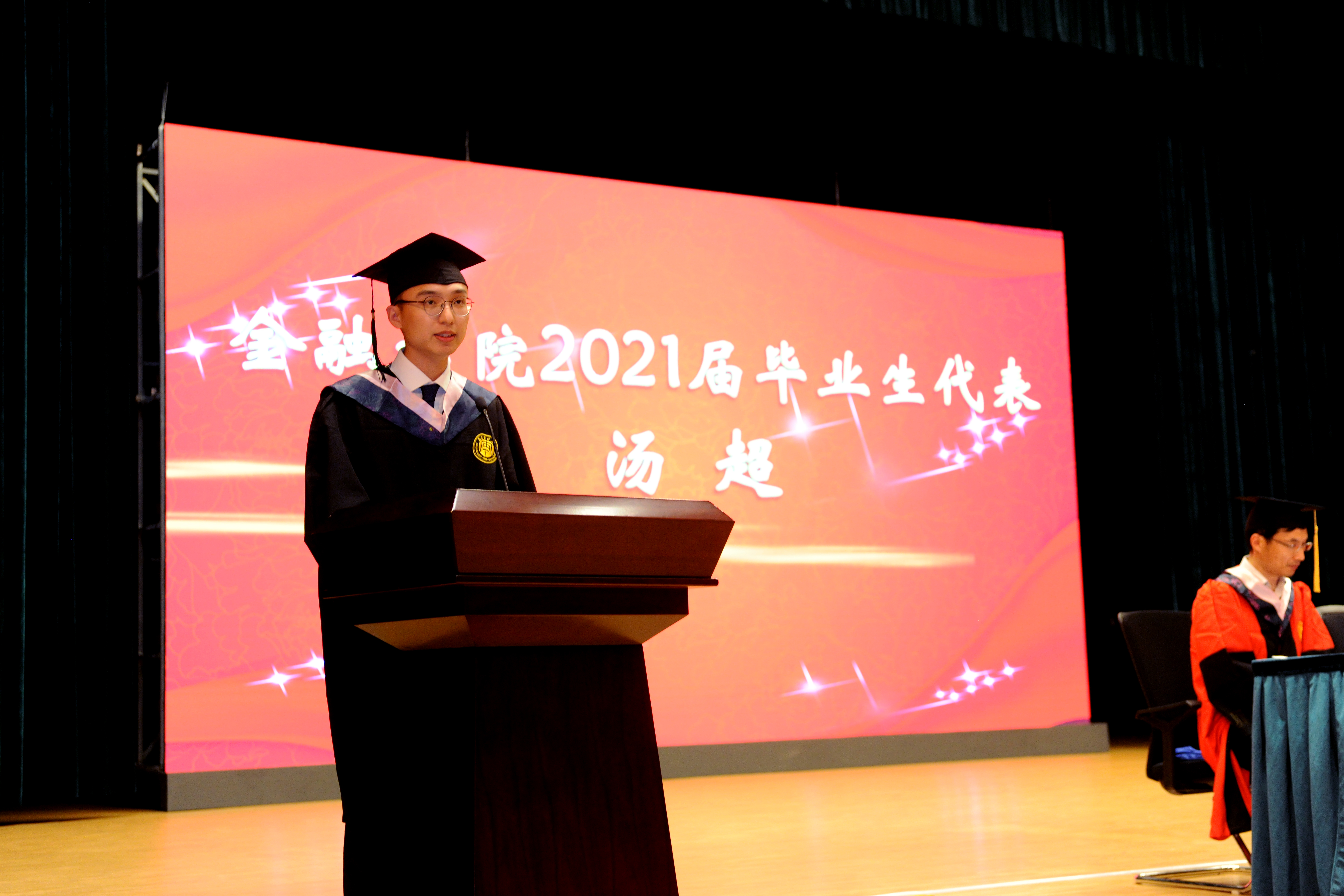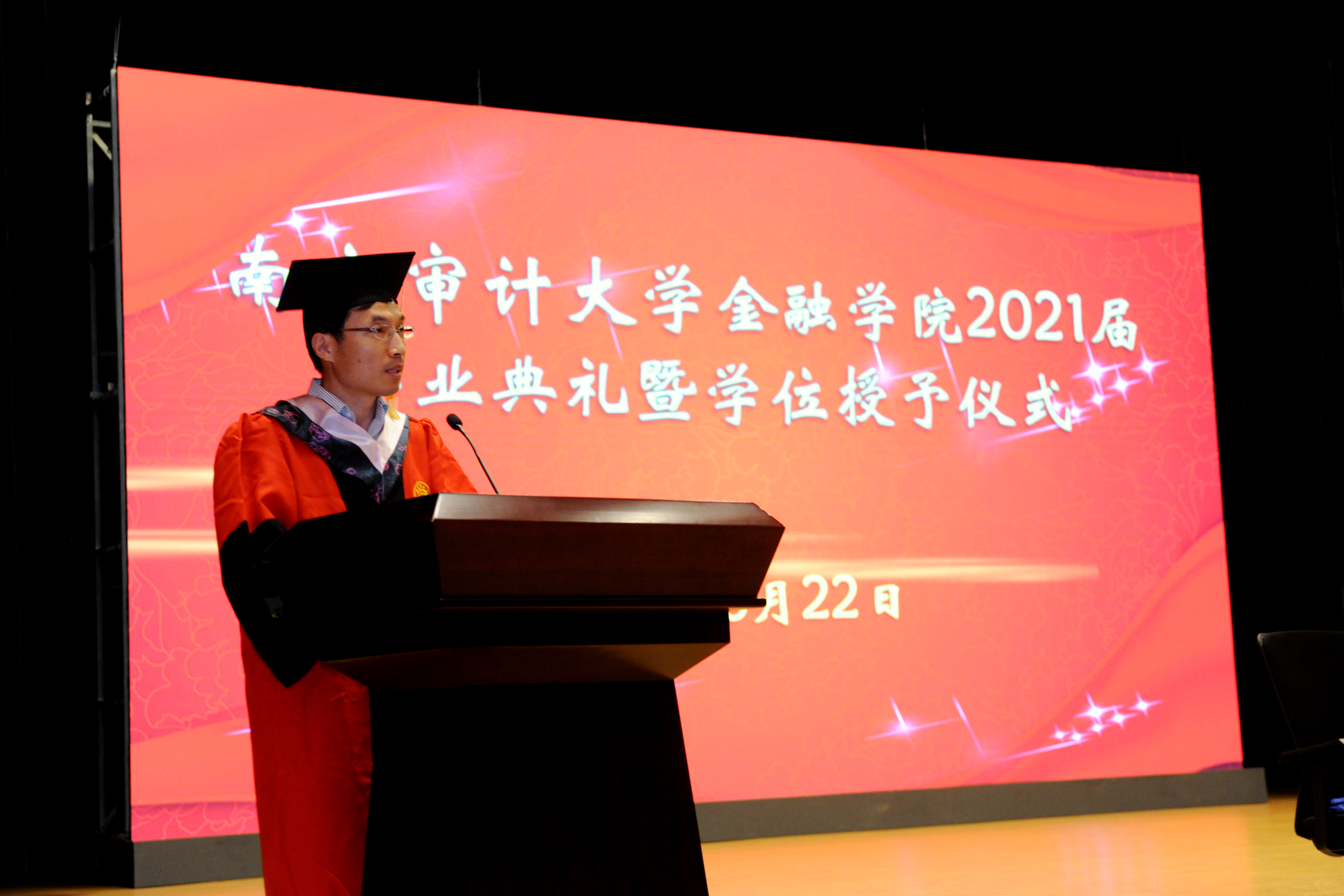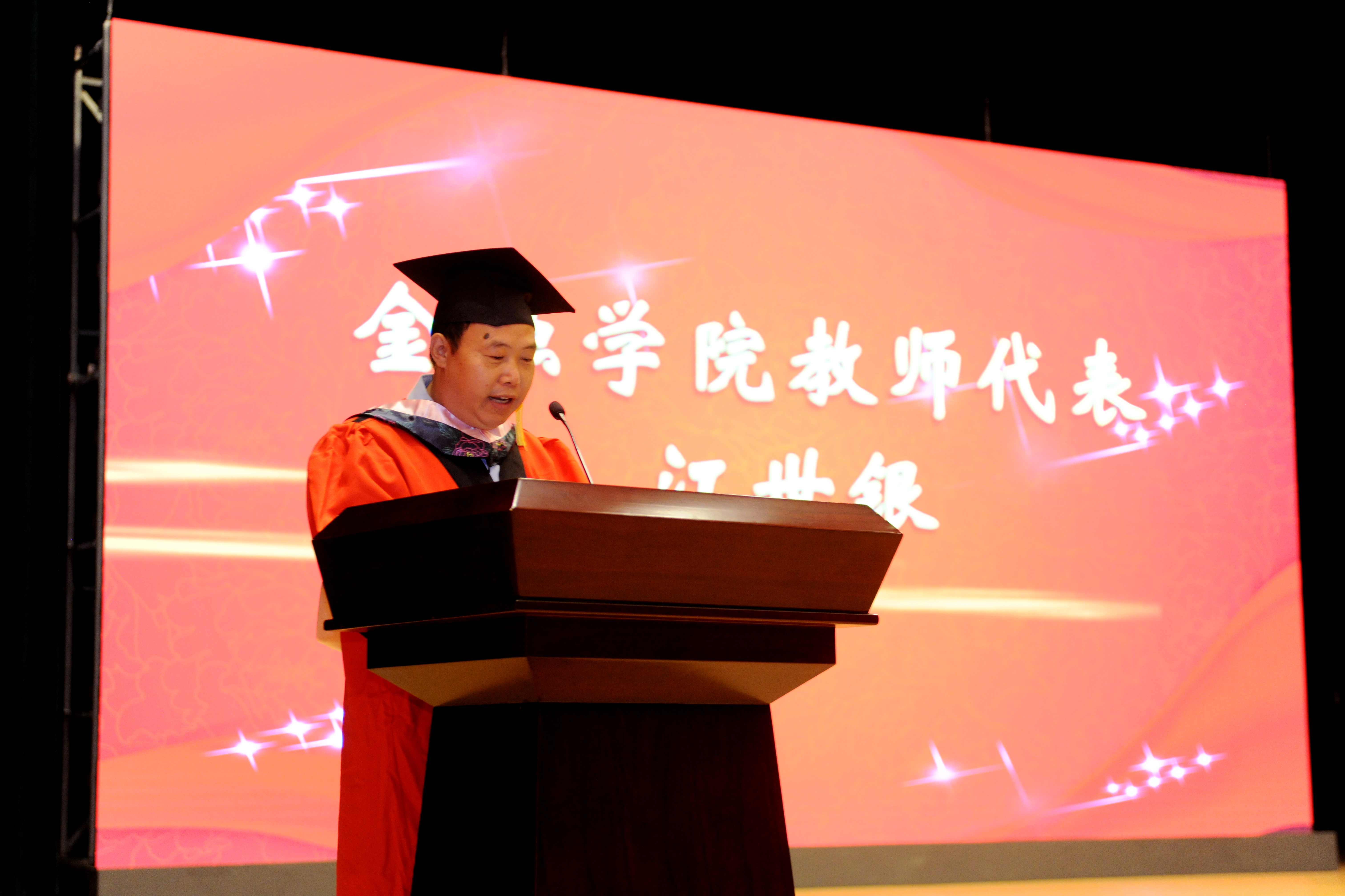 怡红院 教师代表江世银教授围绕“一个祝福,两个要求,三点希望”为毕业典礼致辞。他祝愿同学们前程似锦、一帆风顺。他强调,一要不断学习,不断更新知识,紧跟时代发展的步伐,二要铭记校训“诚信,求是,笃学,致公”,始终做坚守底线,道德自律的人。他向毕业生们提出三点希望:一是,作为砥砺前行的奋斗者,要在专业领域有所建树;二是,在毕业走出校门后,要通过自己的努力过上幸福的金融人生;三是,毕业生们的身份已由学生转变为校友,不要忘记常回母校看看。