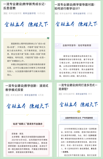 为积极推进学院一流专业建设,提升学院教师授课水平,怡红院 近期在官微进行了一系列专题推送,主题分别为:“教学新秀成长记:反思促教”“教学督导面对面:如何进行教学设计?”“教学创新:浸润式教学模式探索”和“如何打造多范式一流课程?”。通过青年教师们的教学心得与反思总结、学院督导对于教学设计的心得与示范、优秀教师郭岚的浸润式教学模式的探索、“证券投资学”多范式新生态一流课程的引领,进一步推动学院第一课堂改革,达到了反思促教、示范促教的良好效果。