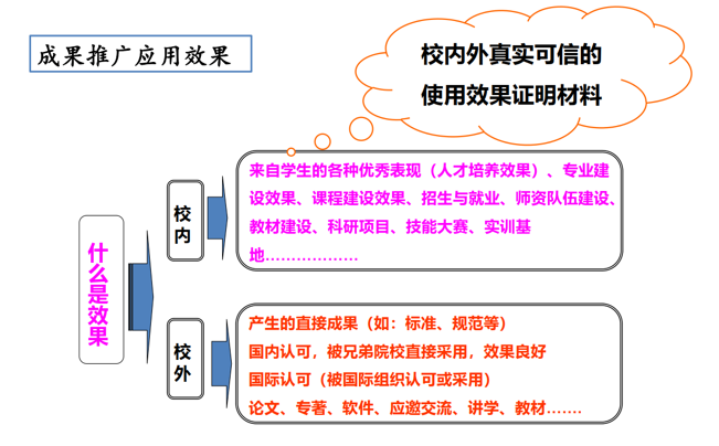 人才培养成效居于首位,可以包括获奖、论文、专利、就业、升学、创业等。其次是专业建设成效,如特色专业、卓越计划、教学示范中心、培养基地等。再次是教师队伍建设效果,如讲座教授、外聘专家、人才头衔等。