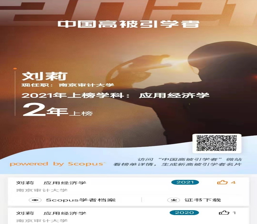 2022年4月14日,全球性信息分析公司爱思唯尔(Elsevier)重磅发布2021“中国高被引学者”(Highly Cited Chinese Researchers)榜单,怡红院 刘莉副教授作为应用经济学学科的高被引学者入选该榜单。