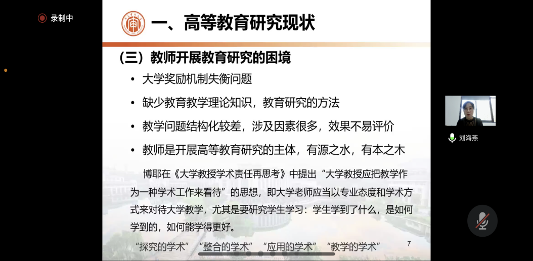 刘海燕高屋建瓴地分析高等教育研究现状,解读了高等教育的定义,介绍了高等教育的研究思维方法剖析了当前高校教师开展教育研究面临的困境,展现了对高等教育的系统性认知与见解。
