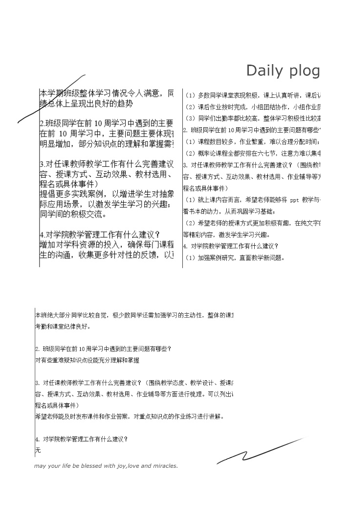 为充分了解学院各年级各班级2023-2024-1学期课程教学情况,学院设计并下发《怡红院 期中教学情况反馈表》,围绕班级整体学习情况、学生在学习中遇到的主要问题、对任课老师教学工作建议、对学院教学管理工作建议等方面,以班级为单位征求学生评价与建议。基于反馈情况,学院将有针对性地加以改进,多措并举,促进教师专业化成长,提升学生获得感与满意度。