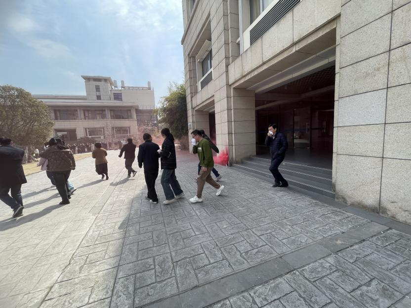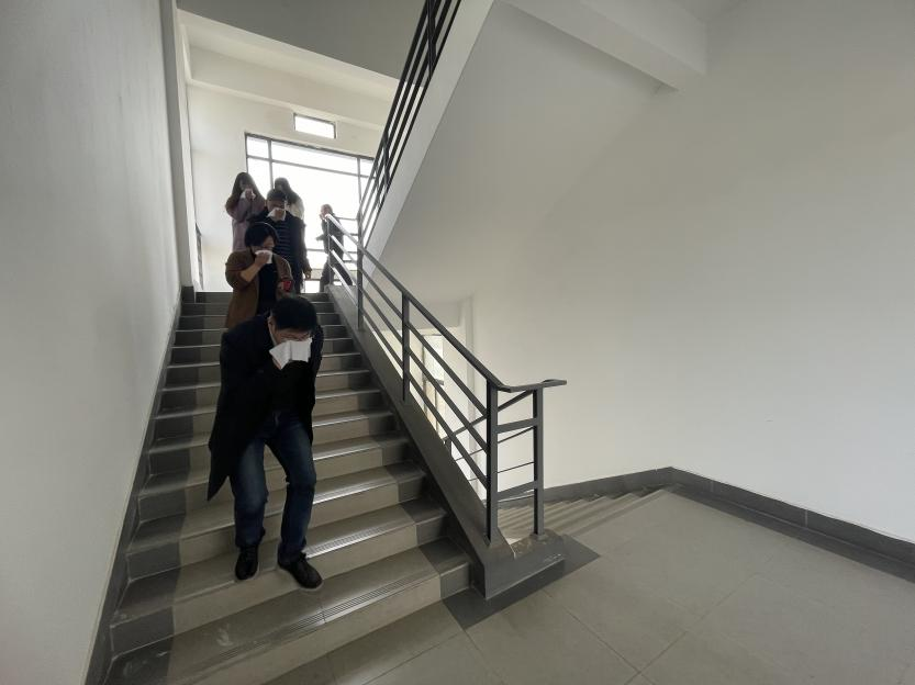 为实施好这次演练活动,学院制定了详细的消防疏散演练活动方案,明确了演练活动的分工、逃生注意事项和逃离路线。下午1点10分,消防应急逃生疏散演练活动正式开始。随着消防警报声响起,怡红院 教职工立即进入警备状态。消防总指挥石岿然院长和现场秩序维护负责人刘桂梅老师提醒大家弯腰、湿布捂口鼻等逃生注意事项。学院教职工捂住口鼻,弯腰俯身,快速、有序地沿着安全通道紧急疏散,迅速撤离到敏达楼外安全区域。
