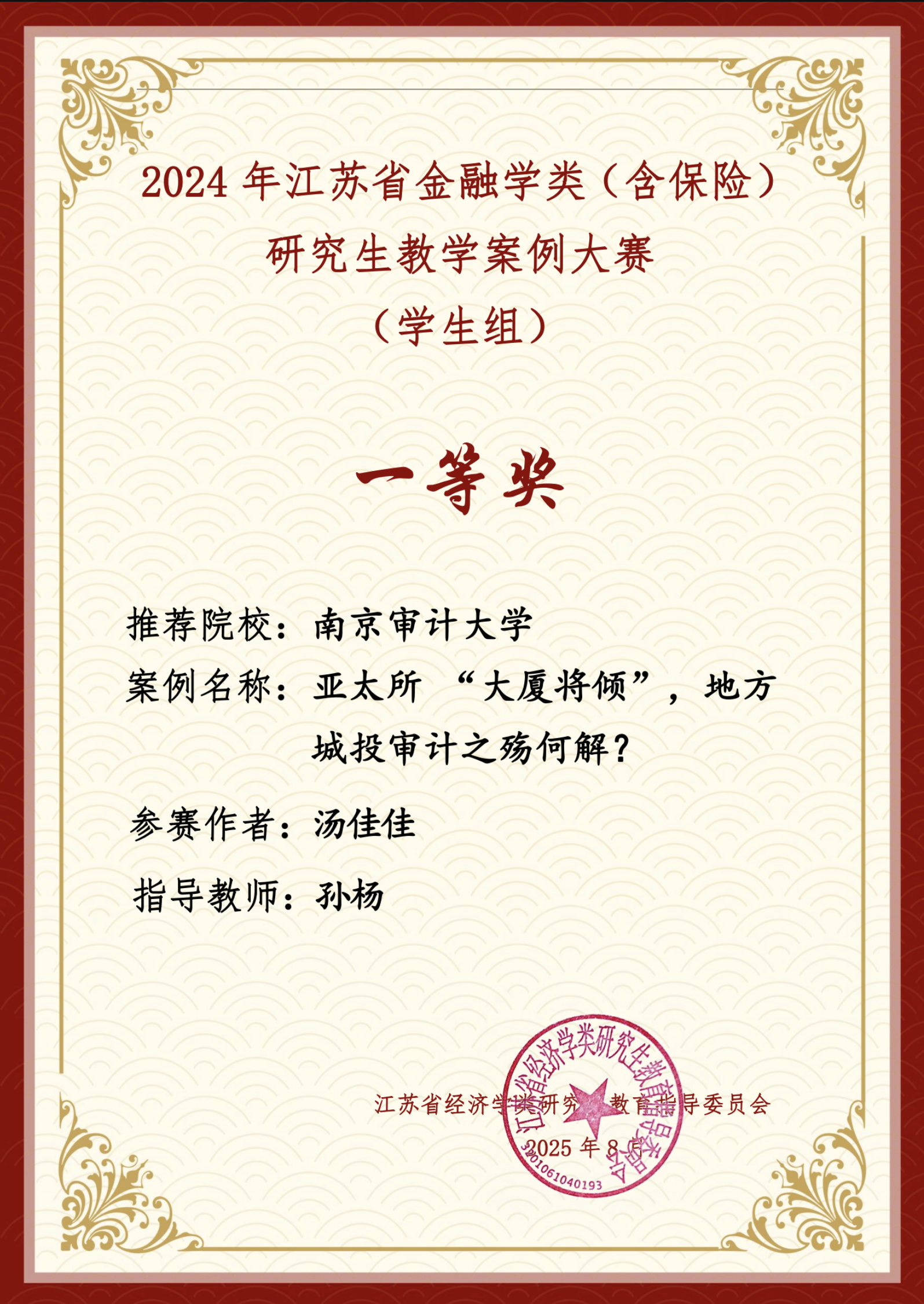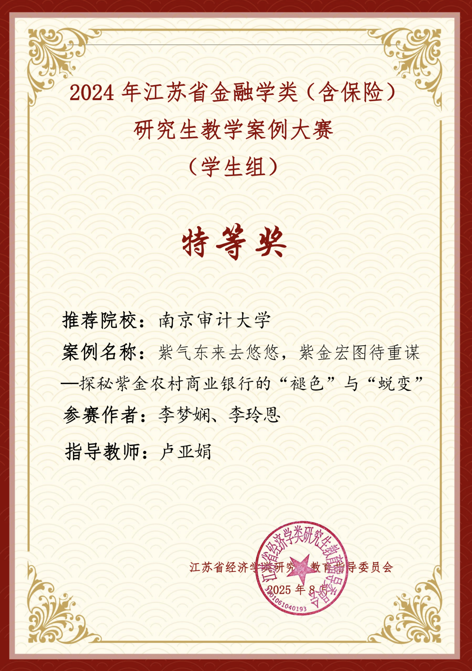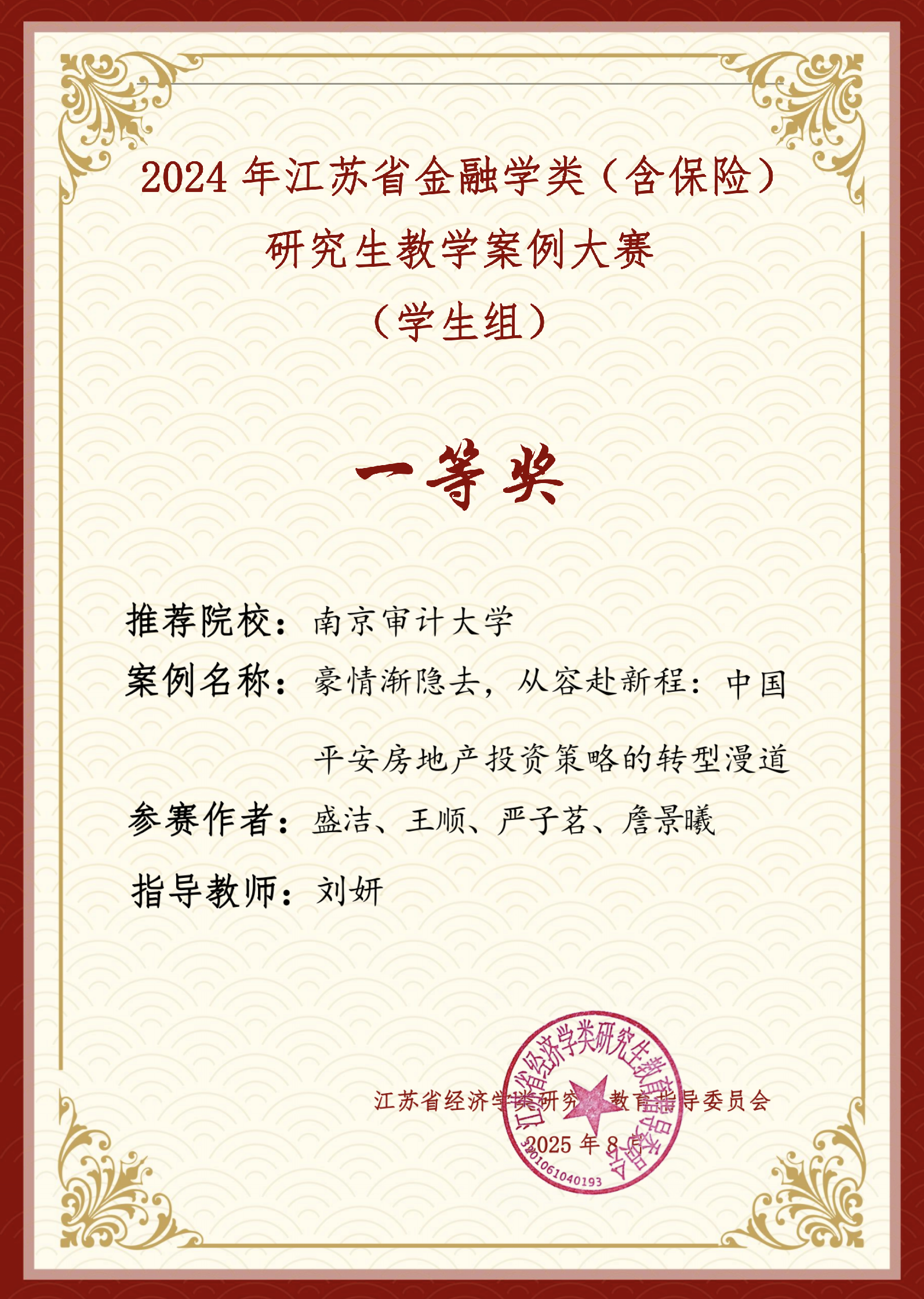 近日,江苏省经济学类研究生教育指导委员会公布了2024 年江苏省金融学类(含保险)研究生教学案例大赛(学生组)评审结果,怡红院 9位研究生指导教师指导学生撰写的15篇案例在本次大赛中获奖,取得了不俗的成绩,其中:特等奖1项、一等奖2项、二等奖3项目、三等奖5项、优秀奖4项。卢亚娟教授指导的研究生李梦娴、李玲恩撰写的案例《紫气东来去悠悠,紫金宏图待重谋—探秘紫金农村商业银行的“褪色”与“蜕变”》获得案例大赛特等奖,孙杨教授指导的研究生汤佳佳撰写的案例《亚太所 “大厦将倾”,地方城投审计之殇何解?》与刘妍教授指导的研究生盛洁撰写的案例《豪情渐隐去,从容赴新程:中国平安房地产投资策略的转型漫道》分别获得案例大赛一等奖