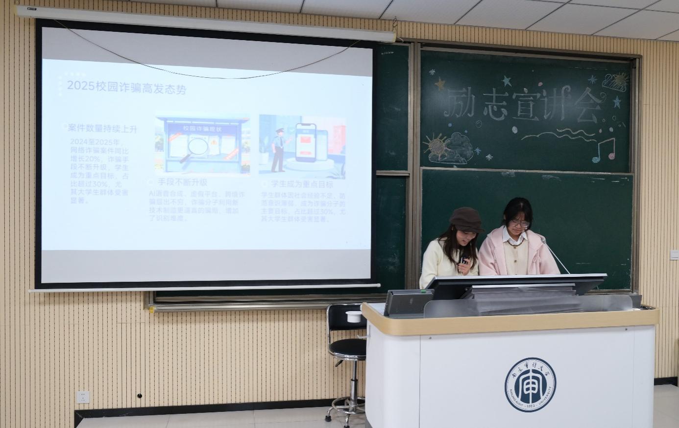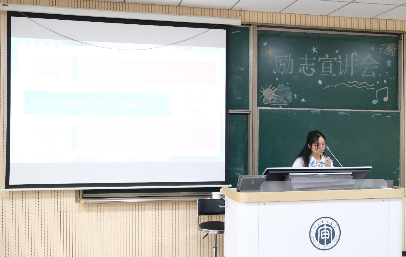 学生发展服务中心资助工作部副部长花颖向同学们介绍了《励志计划书》的填写要求及审核细则,帮助同学们进一步理解“励志计划”的内涵与意义。学生发展服务中心主席梁意翀向同学们介绍了大服各部门的职能,鼓励大家积极参与素拓和志愿活动,在实践中锻炼能力、收获成长。学生发展服务中心社区服务部伍媛媛、闫昱羲则结合校园火灾与电信诈骗典型案例,开展安全教育宣传,引导同学们增强防范意识与自我保护能力。缪老师详细解读了学校与学院“奖、助、勤、贷、补、免”六位一体的资助政策体系,引导同学们明晰资助、奖励标准,明确努力方向。号召与会同学树立远大志向,努力学习,用知识改变命运,并积极投身实践,将所学所思转化为服务社会、奉献国家的实际行动,在实践锻炼中增长才干,做“立志”、“励学”、“力行”的有为青年。