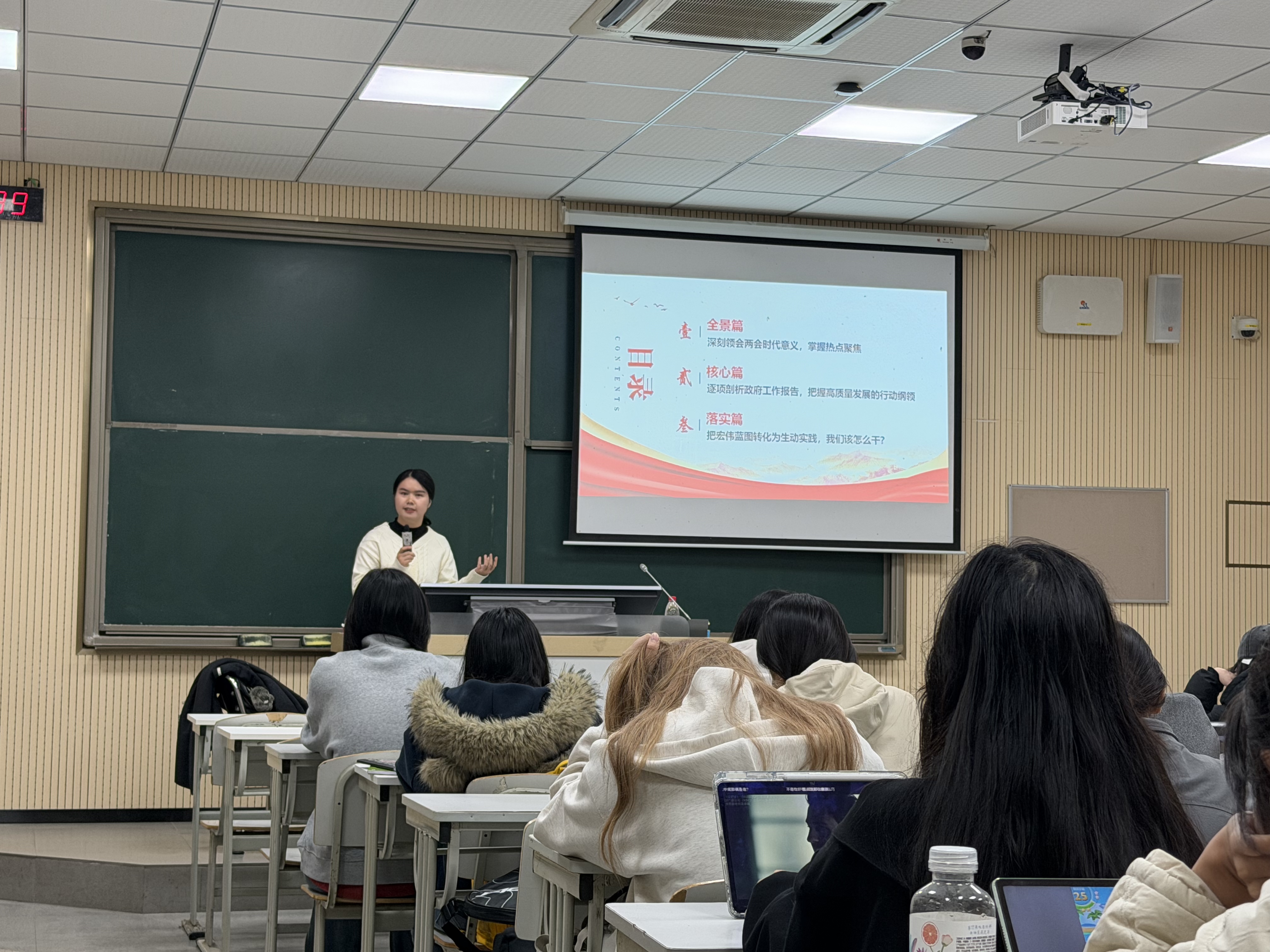 顾梦佳老师围绕“全景篇”“核心篇”“落实篇”三个层次,层层递进,为同学们构建起理解国家战略的系统化思维框架。在“全景篇”中,顾老师带领大家深刻领会两会精神的时代意义,聚焦国家发展战略中的热点议题,引导同学们跳出个人视角的局限,站在历史的长河中审视当下的机遇与挑战,对“国之大者”有了更直观、更深刻的理解。