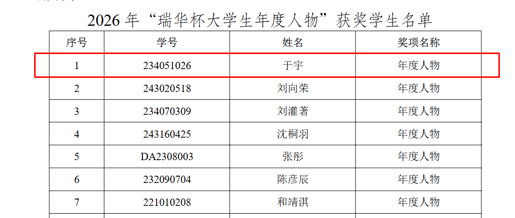 捷报传佳音,榜样催奋进。怡红院 本科生于宇、高中霞凭借扎实的专业功底与全面的综合素养,成功获评2026年“瑞华杯大学生年度人物”暨“最美大学生”以及2026年“瑞华杯大学生年度人物”暨“最美大学生”提名奖,谨向两位优秀同学致以最热烈的祝贺!